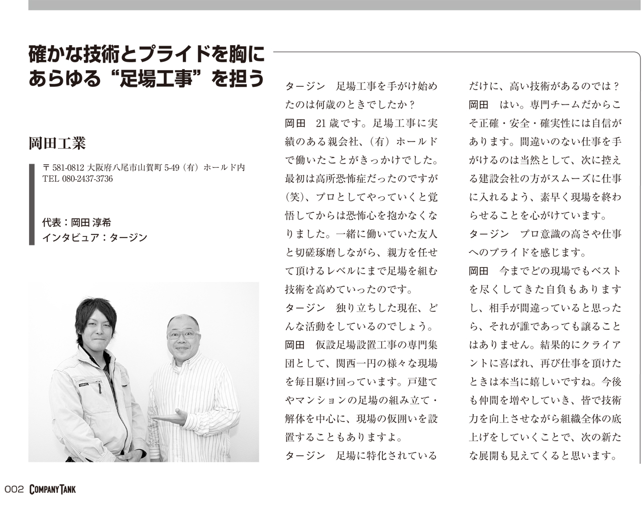 岡田工業は仮設足場設置工事の専門集団として関西一円、あらゆる現場を毎日駆け回っています。